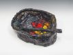 The first room contains the imposingly large Basin Theology/Dracula Boat ceramic resembling a grave or the gothic ship Demeter, while symbolizing the transition between the living and the underworld. Broken pieces arranged inside its large crater recall excavations or aerial views of ravaged landscapes. The varied surfaces and metallic glazes lend a simultaneously ancient and futuristic quality to the works. Creating these works involves a process of multiple firings; the glazes are thick, resembling rich, luridly vibrant lava or burnt embers. Of the similar MORTAR ceramics, Ruby has stated, “I am smashing all of my previous attempts, and futile, contemporary gestures, and placing them into a mortar, and grinding them down with a blunt pestle.”